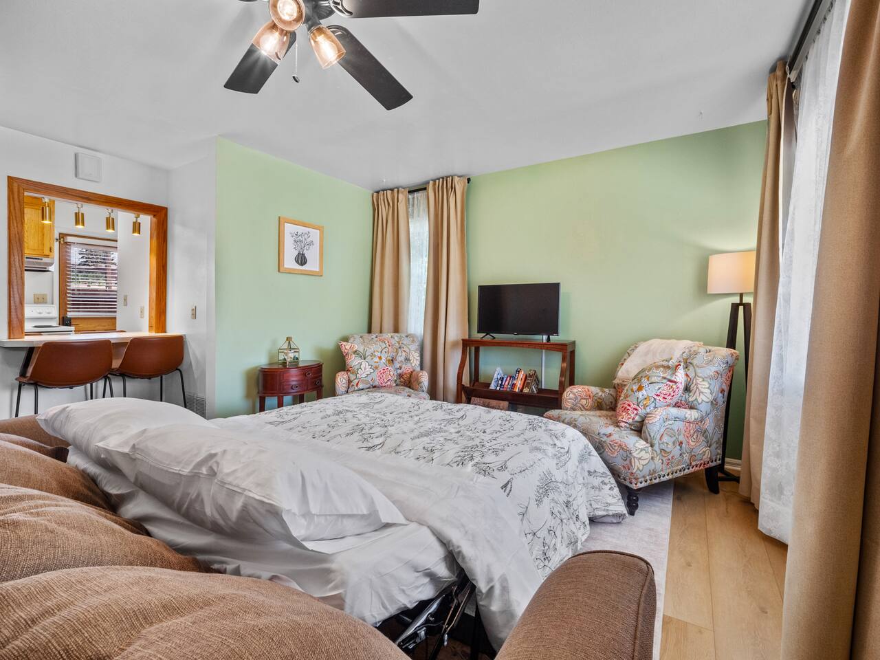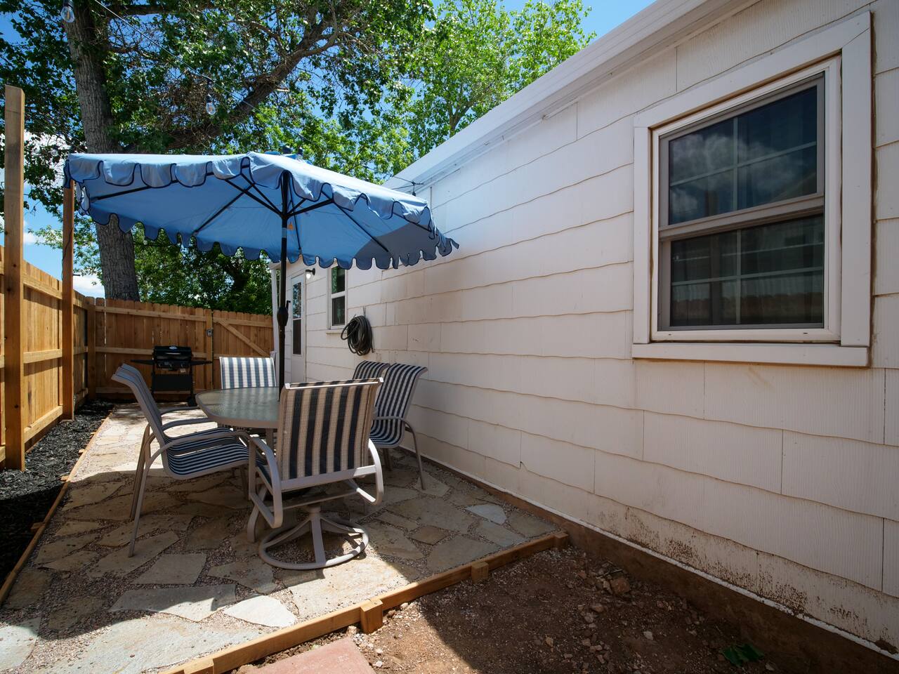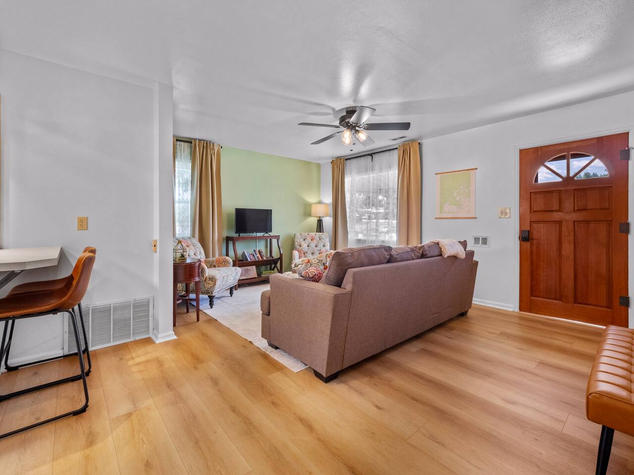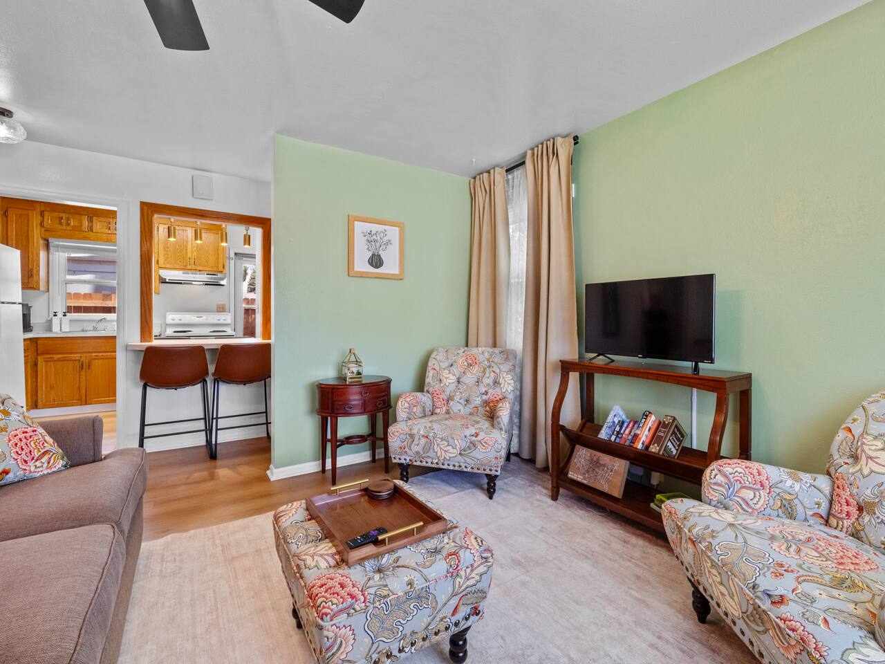 Bedroom 1: King Bed | Bedroom 2: Queen Bed | Living Room: Double/Queen Sofa Bed As you step inside, you'll be greeted by our recently updated home, including fresh paint and LVP flooring. A section of the yard is fenced - great for your furry traveling companions! Please see the Pet Policy, Guest Policy in our House Rules for more information. *Living Area:* - Convertible double sofa bed - Seating for 6 - Flat-screen smart TV, ready for you to login to your own streaming subscriptions (cable TV not included) *Kitchen:* - Fully equipped with cooking essentials - Full-sized appliances: refrigerator, oven range/stove, range hood, microwave - Keurig coffee pot - Starter kit of salt, pepper, oil, coffee, and tea provided Enjoy your meals at the dining bar, which seats four, or outside on the patio, which seats six. During the summer months, grill on the barbecue in the fenced backyard and enjoy Laradise's warm summer nights underneath the twinkle lights! *Laundry:* - Full size washer and dryer - Laundry detergent, stain remover, and dryer balls provided *Both bedrooms include:* - Ceiling fans - Bedside lamps with USB charging - Closet includes hangers, luggage rack, and a cube-style dresser for unpacking - Flat-screen smart TV, ready for you to log in to your streaming subscriptions (cable TV not included) The first bedroom includes a king bed and a dedicated workspace features a comfortable chair and lamp with USB outlet. The second bedroom includes a queen bed. *Bathroom:* - Tub/shower combo - Adjustable shower head, including both handheld and wall-mounted shower heads (updated since our photos!) - Fresh towels and makeup remover towels - Hairdryer - Complimentary toiletries