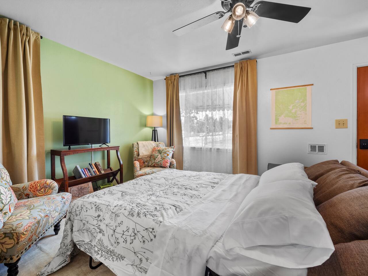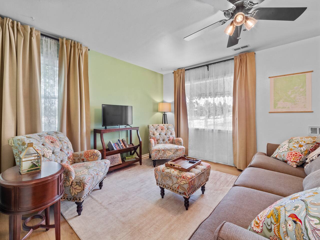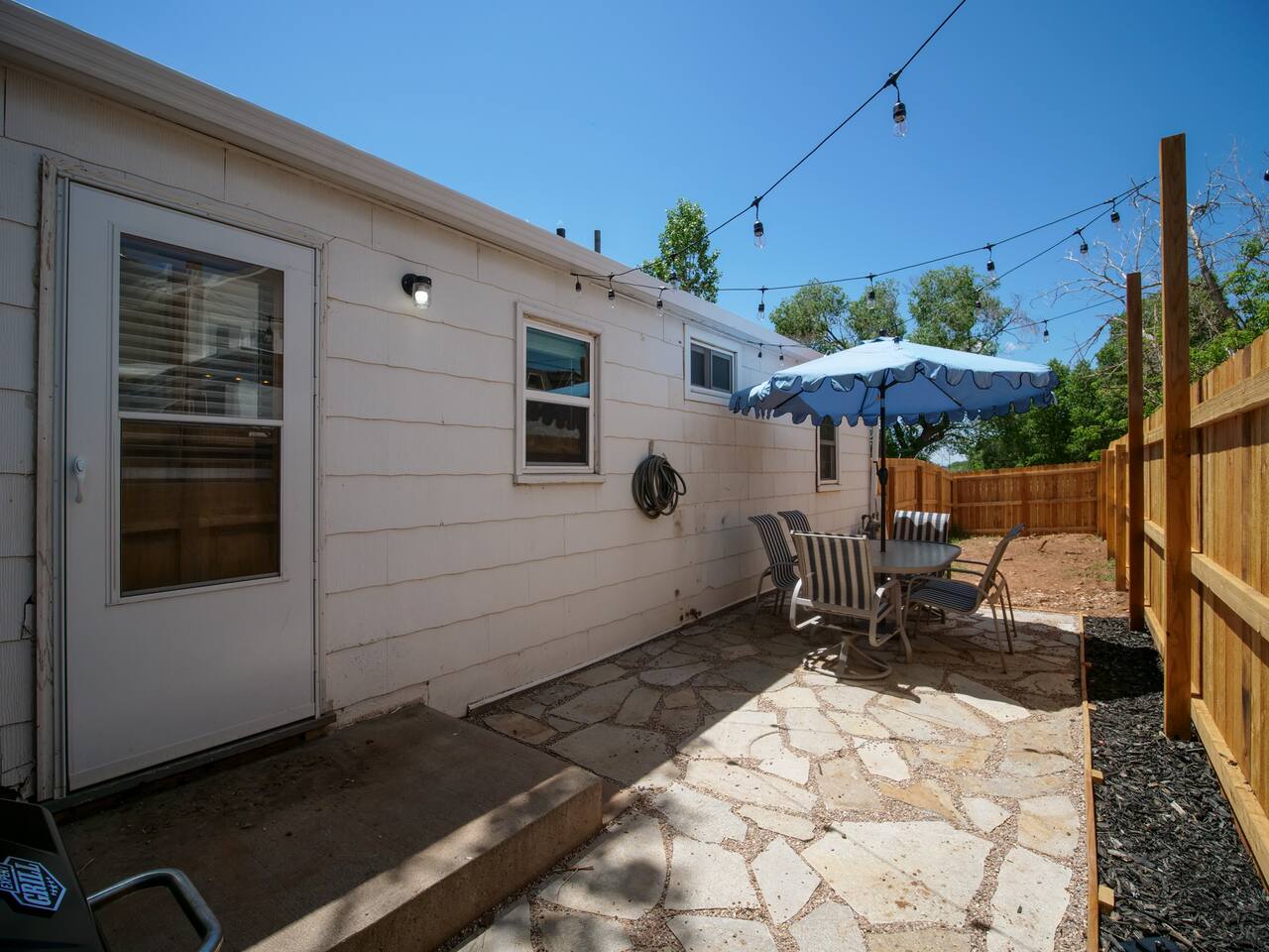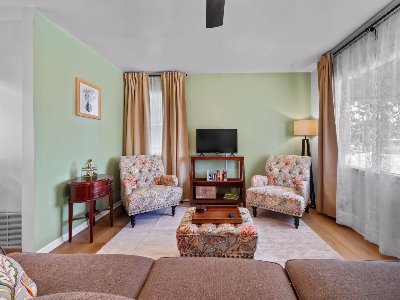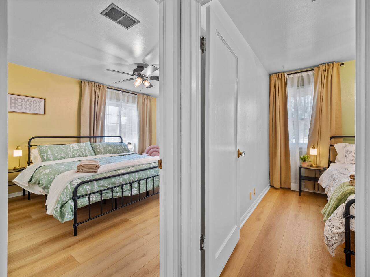 Bedroom 1: King Bed | Bedroom 2: Queen Bed | Living Room: Double/Queen Sofa Bed As you step inside, you'll be greeted by our recently updated home, including fresh paint and LVP flooring. A section of the yard is fenced - great for your furry traveling companions! Please see the Pet Policy, Guest Policy in our House Rules for more information. *Living Area:* - Convertible double sofa bed - Seating for 6 - Flat-screen smart TV, ready for you to login to your own streaming subscriptions (cable TV not included) *Kitchen:* - Fully equipped with cooking essentials - Full-sized appliances: refrigerator, oven range/stove, range hood, microwave - Keurig coffee pot - Starter kit of salt, pepper, oil, coffee, and tea provided Enjoy your meals at the dining bar, which seats four, or outside on the patio, which seats six. During the summer months, grill on the barbecue in the fenced backyard and enjoy Laradise's warm summer nights underneath the twinkle lights! *Laundry:* - Full size washer and dryer - Laundry detergent, stain remover, and dryer balls provided *Both bedrooms include:* - Ceiling fans - Bedside lamps with USB charging - Closet includes hangers, luggage rack, and a cube-style dresser for unpacking - Flat-screen smart TV, ready for you to log in to your streaming subscriptions (cable TV not included) The first bedroom includes a king bed and a dedicated workspace features a comfortable chair and lamp with USB outlet. The second bedroom includes a queen bed. *Bathroom:* - Tub/shower combo - Adjustable shower head, including both handheld and wall-mounted shower heads (updated since our photos!) - Fresh towels and makeup remover towels - Hairdryer - Complimentary toiletries
