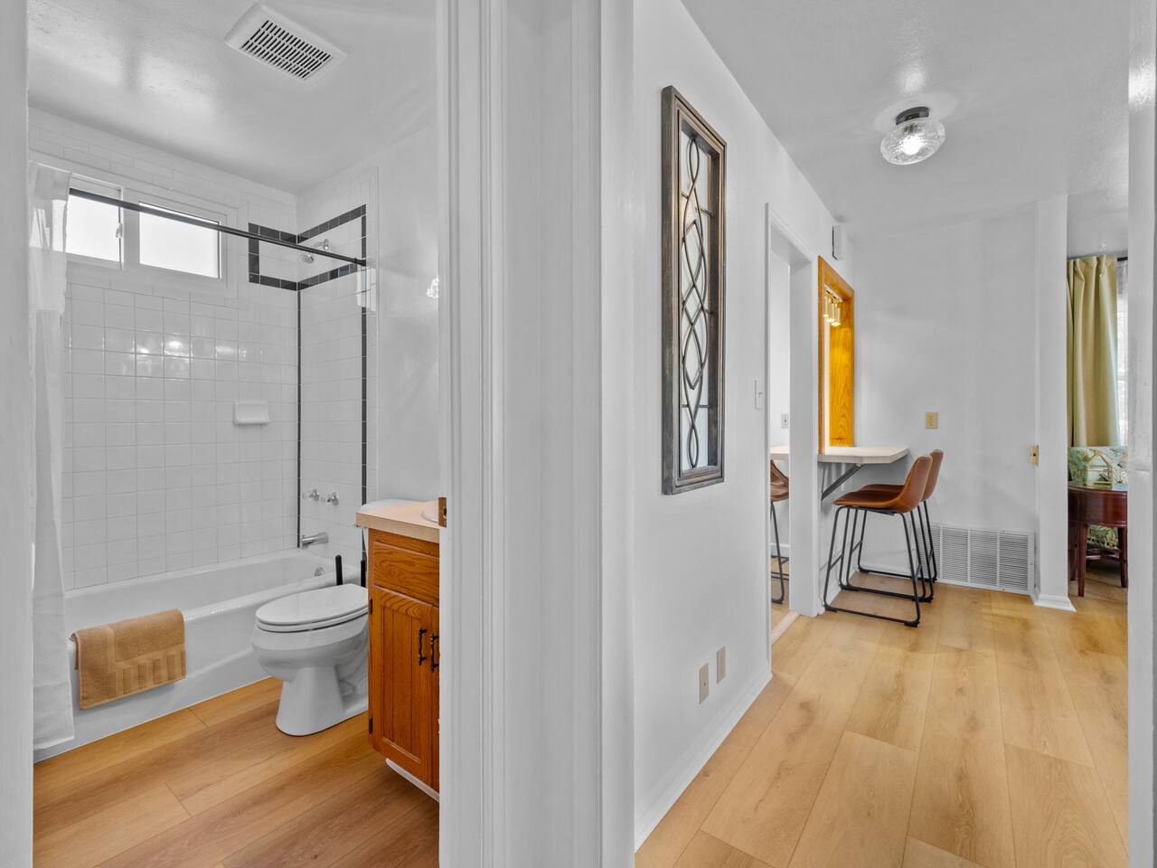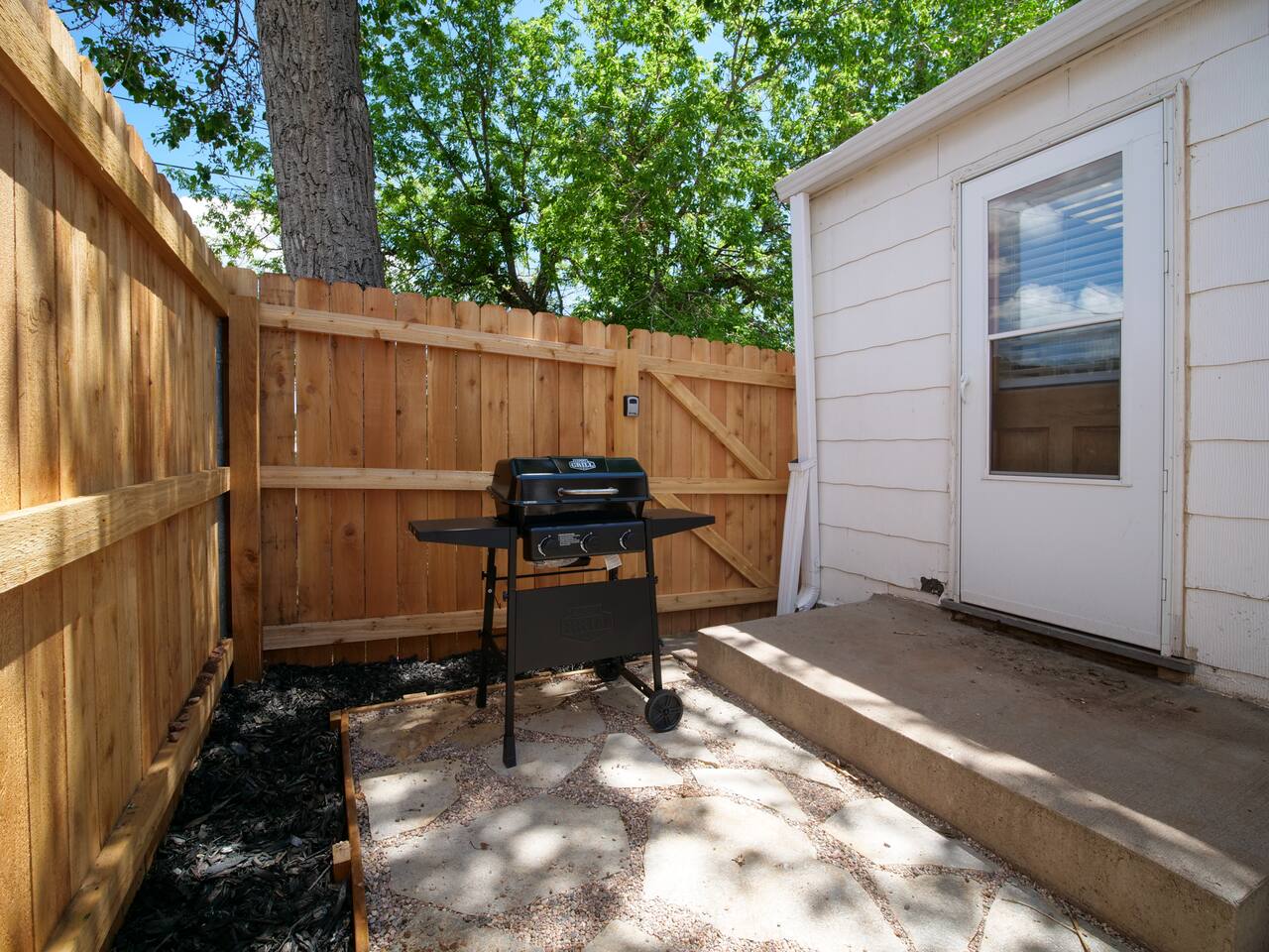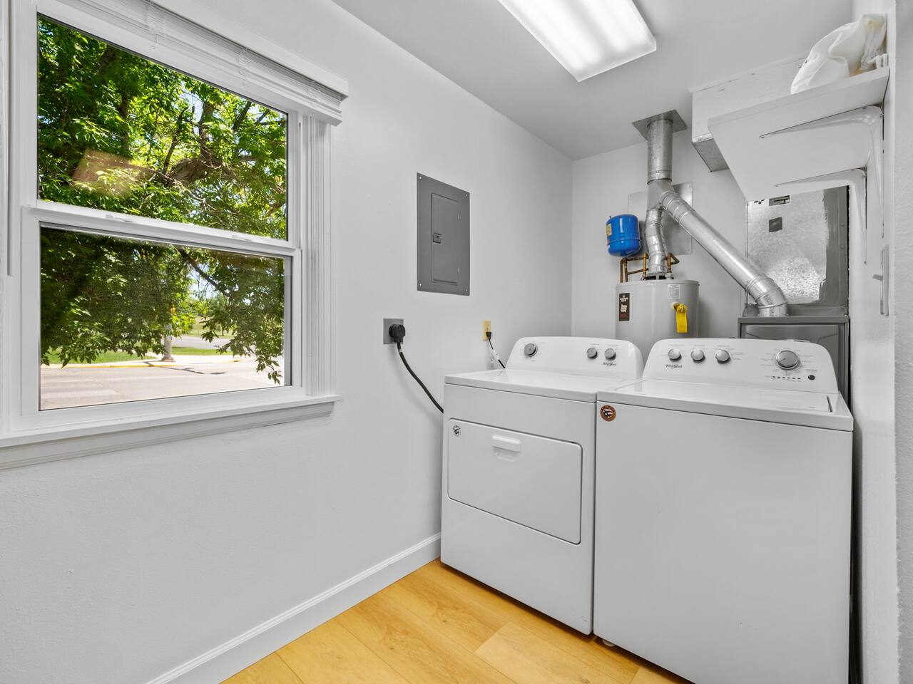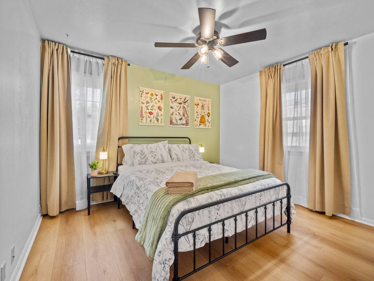 Bedroom 1: King Bed | Bedroom 2: Queen Bed | Living Room: Double/Queen Sofa Bed As you step inside, you'll be greeted by our recently updated home, including fresh paint and LVP flooring. A section of the yard is fenced - great for your furry traveling companions! Please see the Pet Policy, Guest Policy in our House Rules for more information. *Living Area:* - Convertible double sofa bed - Seating for 6 - Flat-screen smart TV, ready for you to login to your own streaming subscriptions (cable TV not included) *Kitchen:* - Fully equipped with cooking essentials - Full-sized appliances: refrigerator, oven range/stove, range hood, microwave - Keurig coffee pot - Starter kit of salt, pepper, oil, coffee, and tea provided Enjoy your meals at the dining bar, which seats four, or outside on the patio, which seats six. During the summer months, grill on the barbecue in the fenced backyard and enjoy Laradise's warm summer nights underneath the twinkle lights! *Laundry:* - Full size washer and dryer - Laundry detergent, stain remover, and dryer balls provided *Both bedrooms include:* - Ceiling fans - Bedside lamps with USB charging - Closet includes hangers, luggage rack, and a cube-style dresser for unpacking - Flat-screen smart TV, ready for you to log in to your streaming subscriptions (cable TV not included) The first bedroom includes a king bed and a dedicated workspace features a comfortable chair and lamp with USB outlet. The second bedroom includes a queen bed. *Bathroom:* - Tub/shower combo - Adjustable shower head, including both handheld and wall-mounted shower heads (updated since our photos!) - Fresh towels and makeup remover towels - Hairdryer - Complimentary toiletries