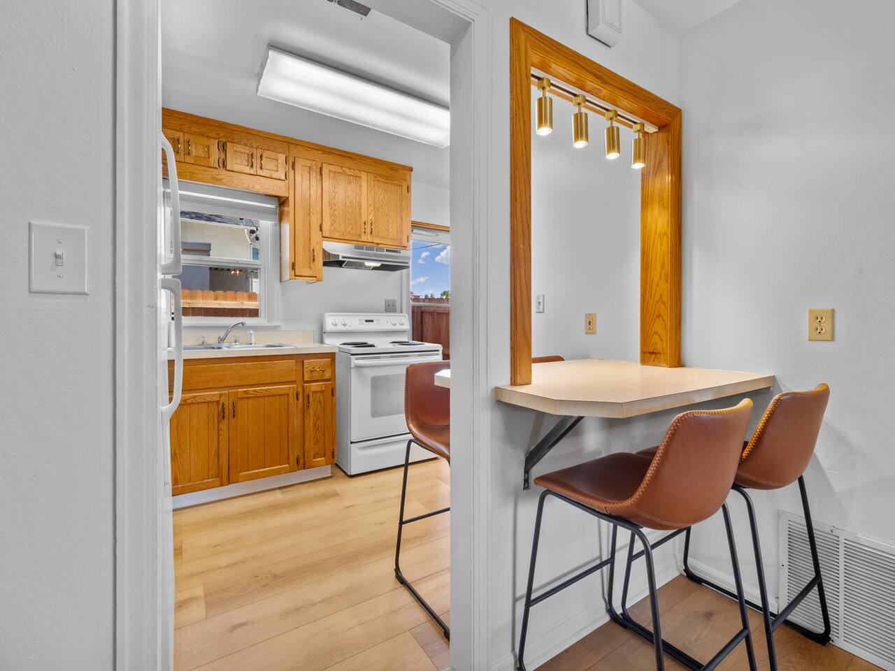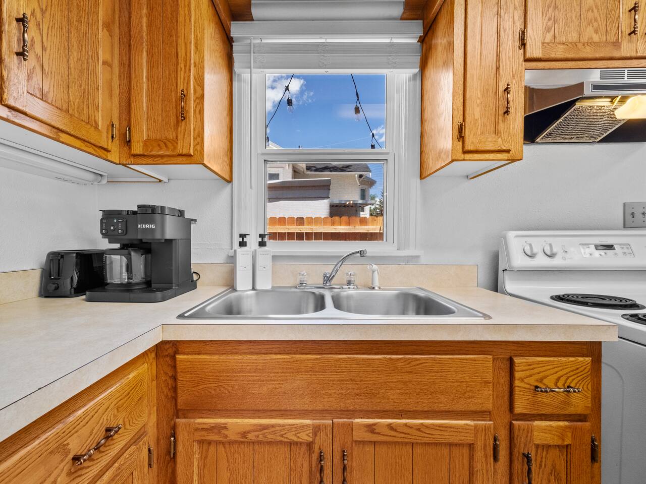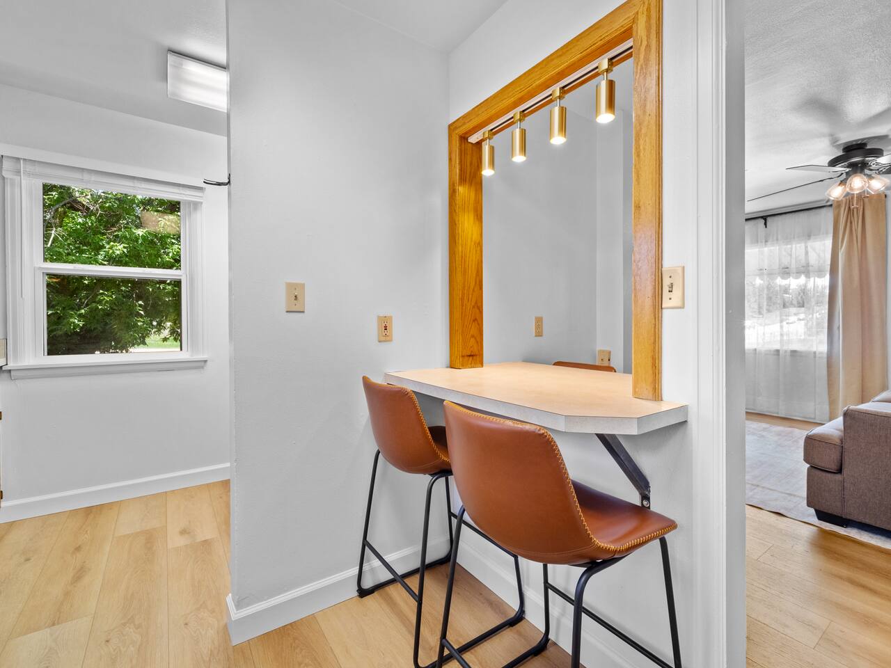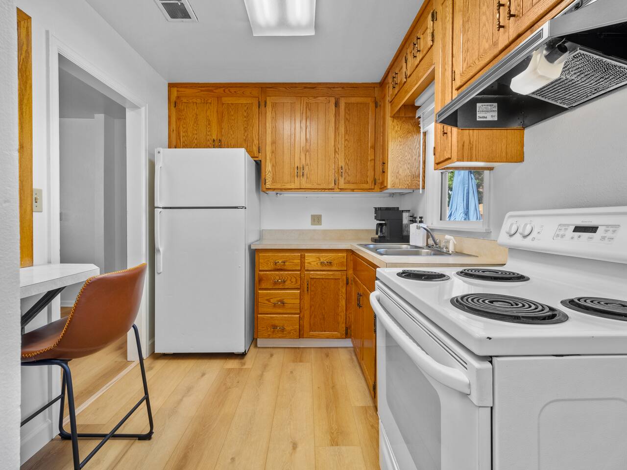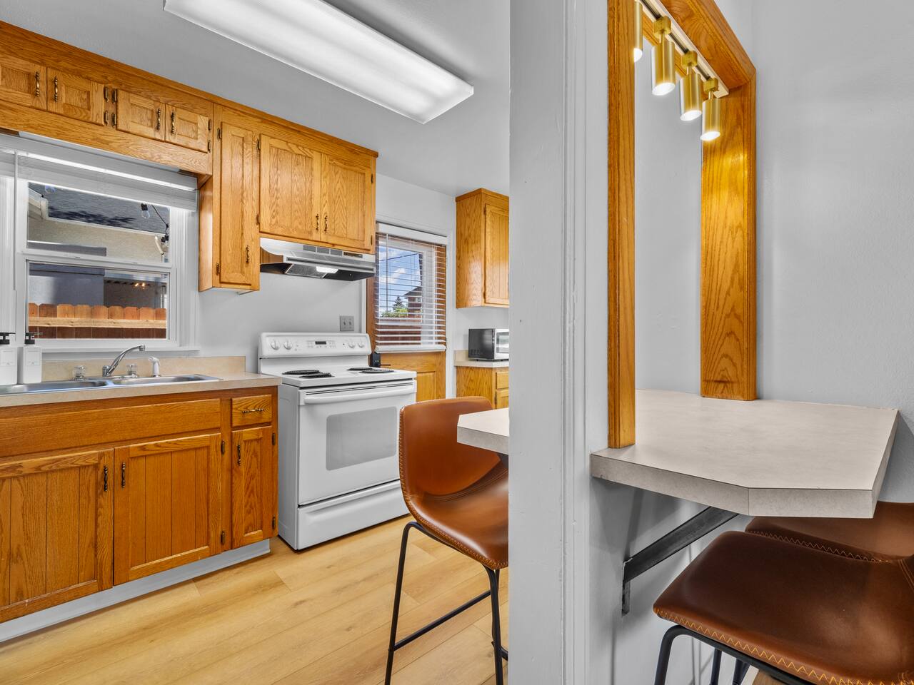 Bedroom 1: King Bed | Bedroom 2: Queen Bed | Living Room: Double/Queen Sofa Bed As you step inside, you'll be greeted by our recently updated home, including fresh paint and LVP flooring. A section of the yard is fenced - great for your furry traveling companions! Please see the Pet Policy, Guest Policy in our House Rules for more information. *Living Area:* - Convertible double sofa bed - Seating for 6 - Flat-screen smart TV, ready for you to login to your own streaming subscriptions (cable TV not included) *Kitchen:* - Fully equipped with cooking essentials - Full-sized appliances: refrigerator, oven range/stove, range hood, microwave - Keurig coffee pot - Starter kit of salt, pepper, oil, coffee, and tea provided Enjoy your meals at the dining bar, which seats four, or outside on the patio, which seats six. During the summer months, grill on the barbecue in the fenced backyard and enjoy Laradise's warm summer nights underneath the twinkle lights! *Laundry:* - Full size washer and dryer - Laundry detergent, stain remover, and dryer balls provided *Both bedrooms include:* - Ceiling fans - Bedside lamps with USB charging - Closet includes hangers, luggage rack, and a cube-style dresser for unpacking - Flat-screen smart TV, ready for you to log in to your streaming subscriptions (cable TV not included) The first bedroom includes a king bed and a dedicated workspace features a comfortable chair and lamp with USB outlet. The second bedroom includes a queen bed. *Bathroom:* - Tub/shower combo - Adjustable shower head, including both handheld and wall-mounted shower heads (updated since our photos!) - Fresh towels and makeup remover towels - Hairdryer - Complimentary toiletries