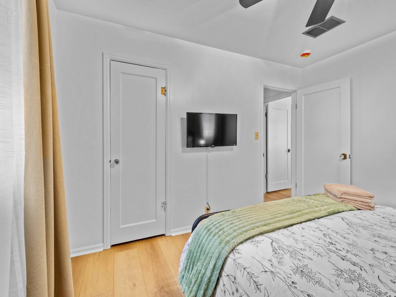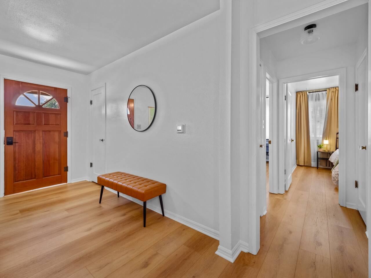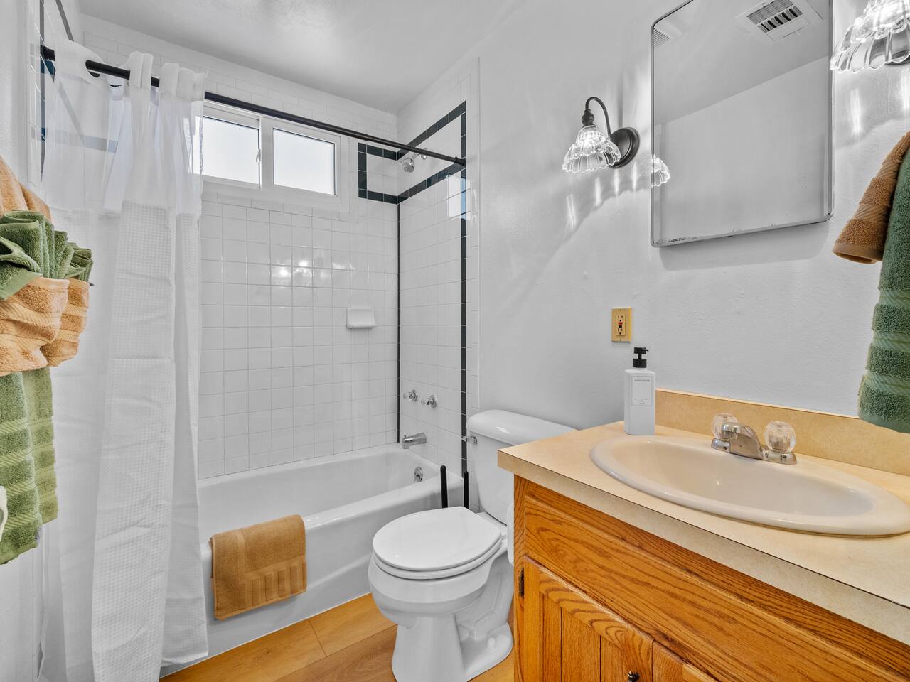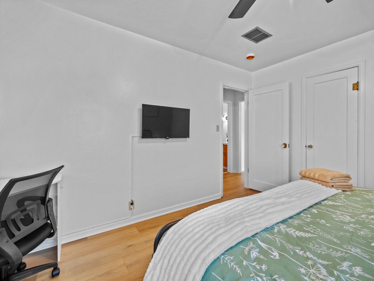 Bedroom 1: King Bed | Bedroom 2: Queen Bed | Living Room: Double/Queen Sofa Bed As you step inside, you'll be greeted by our recently updated home, including fresh paint and LVP flooring. A section of the yard is fenced - great for your furry traveling companions! Please see the Pet Policy, Guest Policy in our House Rules for more information. *Living Area:* - Convertible double sofa bed - Seating for 6 - Flat-screen smart TV, ready for you to login to your own streaming subscriptions (cable TV not included) *Kitchen:* - Fully equipped with cooking essentials - Full-sized appliances: refrigerator, oven range/stove, range hood, microwave - Keurig coffee pot - Starter kit of salt, pepper, oil, coffee, and tea provided Enjoy your meals at the dining bar, which seats four, or outside on the patio, which seats six. During the summer months, grill on the barbecue in the fenced backyard and enjoy Laradise's warm summer nights underneath the twinkle lights! *Laundry:* - Full size washer and dryer - Laundry detergent, stain remover, and dryer balls provided *Both bedrooms include:* - Ceiling fans - Bedside lamps with USB charging - Closet includes hangers, luggage rack, and a cube-style dresser for unpacking - Flat-screen smart TV, ready for you to log in to your streaming subscriptions (cable TV not included) The first bedroom includes a king bed and a dedicated workspace features a comfortable chair and lamp with USB outlet. The second bedroom includes a queen bed. *Bathroom:* - Tub/shower combo - Adjustable shower head, including both handheld and wall-mounted shower heads (updated since our photos!) - Fresh towels and makeup remover towels - Hairdryer - Complimentary toiletries